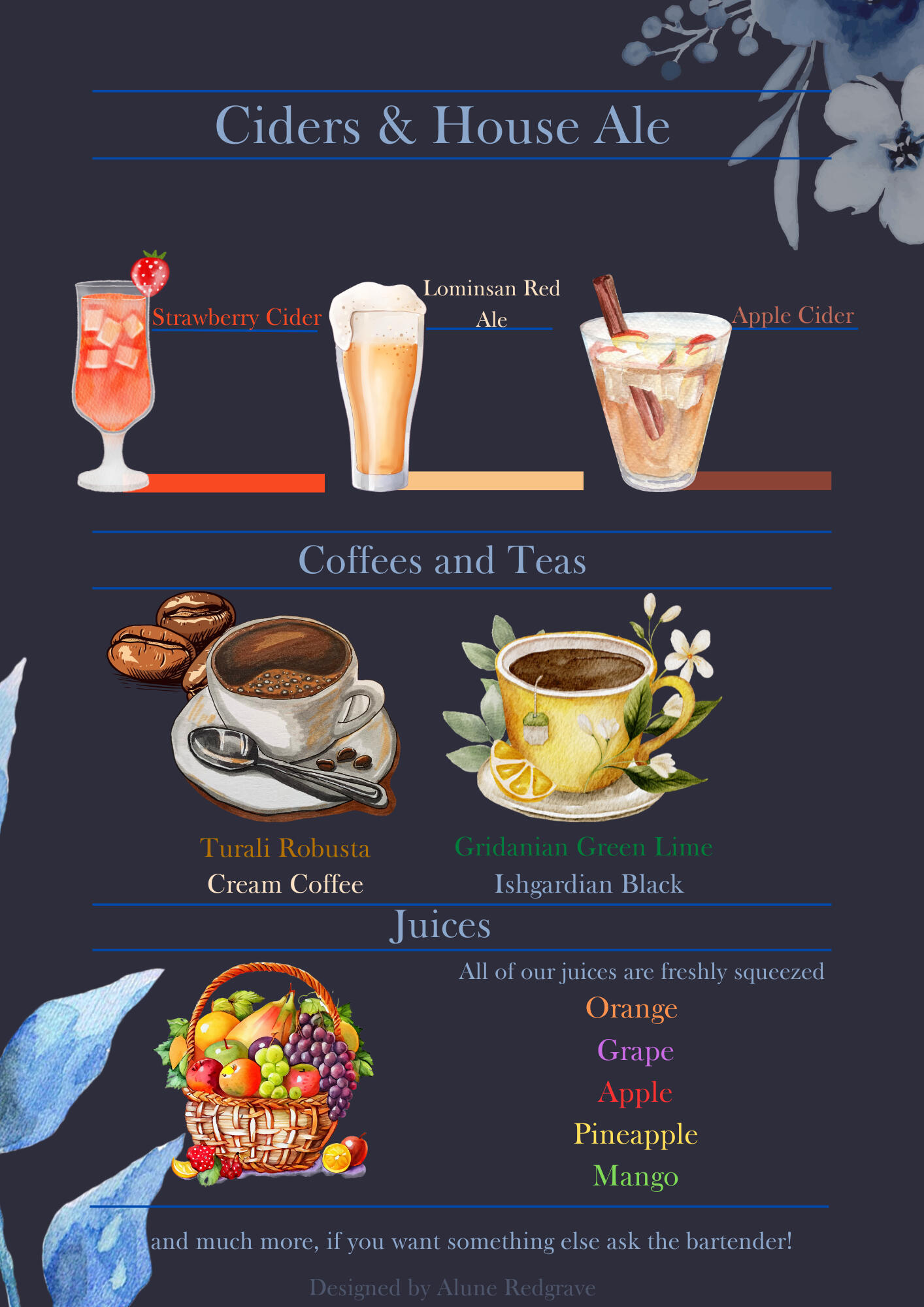Alune is the bar's mistress, and enjoys being tasked to create innovative and challenging drinks. She is an empathetic and bubbly individual that values her freedom and her friends above all.However friendly she may appear, she holds some things sacred, such as her independence, and her territory. Disrespecting her boundaries was the last thing that many people did in their lives."You misunderstand: my patience is vast and my morality is vertuous. However, there are things I do not compromise on: set one toe behind my bar and you shall lose it."
